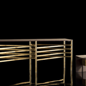 Дизайн Massimo Castagna. Тверда деревина, товщина 1,5 см. Оздоблення: термічно оброблені породи дерева з наших зразків, а також обробка маслом з болотного дуба і в’яза на основі натурального воску та води або латуні, оброблена вручну традиційними методами. Розміри: 240 cm x 75 cm x 75 cm h; 280 cm x 75 cm x 75 cm h.